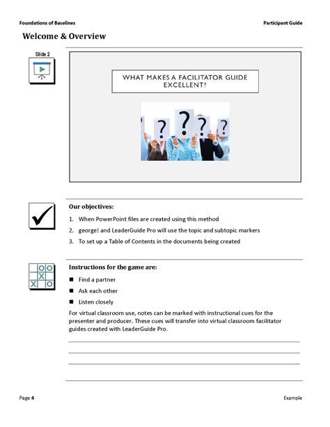 Participant Guide Examples - It might also have reflection questions, or knowledge checks intended to be for the participant only (not as course data you’ll collect). Web by following these tips, you can create participant guides that effectively guide learners through the learning journey, foster. Web creating a session that resonates with your audience requires a facilitator guide template that is adaptable and aligned.